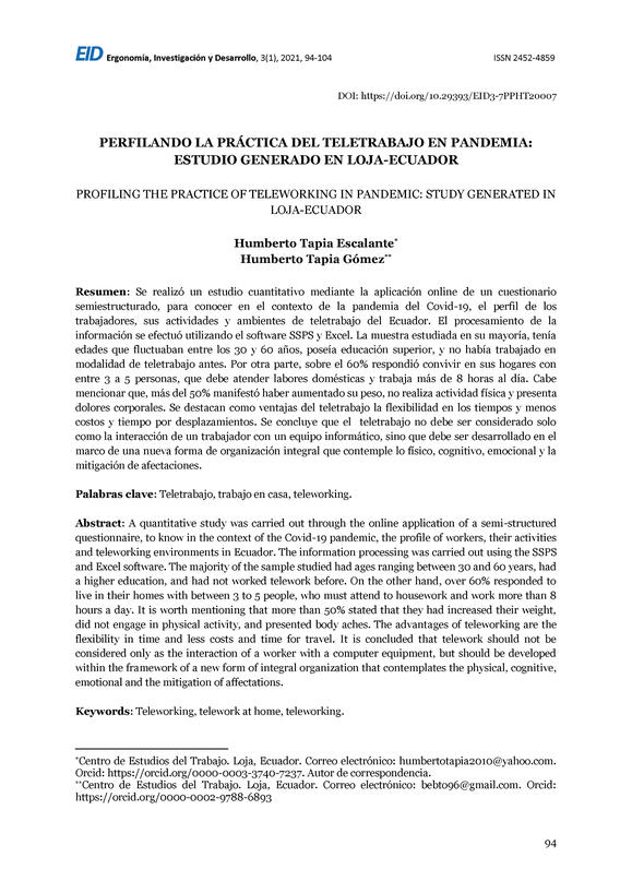 Se realizó un estudio cuantitativo mediante la aplicación online de un cuestionario semiestructurado, para conocer en el contexto de la pandemia del Covid-19, el perfil de los trabajadores, sus actividades y ambientes de teletrabajo del Ecuador. El procesamiento de la información se efectuó utilizando el software SSPS y Excel. La muestra estudiada, en su mayoría, tenía edades que fluctuaban entre los 30 y 60 años, poseía educación superior y no había trabajado en modalidad de teletrabajo antes. Por otra parte, sobre el 60% respondió convivir en sus hogares con entre 3 a 5 personas, que debe atender labores domésticas y trabaja más de 8 horas al día. Cabe mencionar que, más del 50% manifestó haber aumentado su peso, no realiza actividad física y presenta dolores corporales. Se destacan como ventajas del teletrabajo la flexibilidad en los tiempos y menos costos y tiempo por desplazamientos. Se concluye que el teletrabajo no debe ser considerado solo como la interacción de un trabajador con un equipo informático, sino que debe ser desarrollado en el marco de una nueva forma de organización integral que contemple lo físico, cognitivo, emocional y la mitigación de afectaciones.