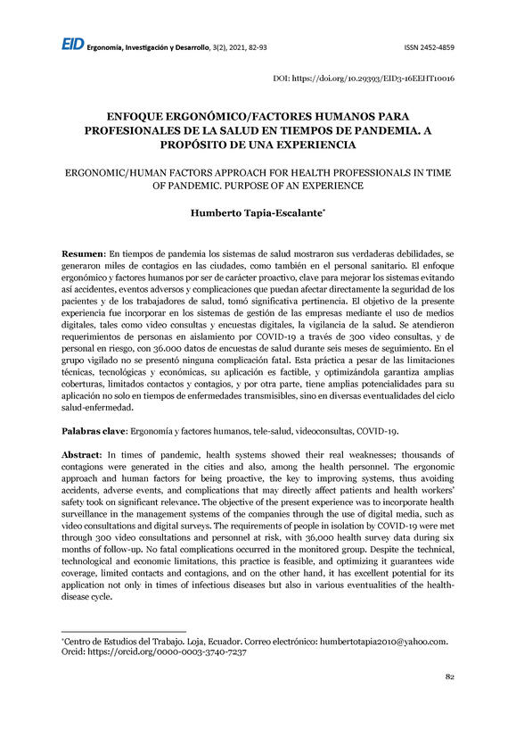 En tiempos de pandemia, los sistemas de salud mostraron sus verdaderas debilidades, generándose miles de contagios en las ciudades, como también en el personal sanitario. El enfoque ergonómico y factores humanos, por ser de carácter proactivo y clave para mejorar los sistemas evitando accidentes, eventos adversos y complicaciones que puedan afectar directamente la seguridad de los pacientes y de los trabajadores de salud, tomó significativa pertinencia. El objetivo de la presente experiencia fue incorporar en los sistemas de gestión de las empresas, mediante el uso de medios digitales, tales como videoconsultas y encuestas digitales, la vigilancia de la salud. Se atendieron requerimientos de personas en aislamiento por COVID-19 a través de 300 videoconsultas y de personal en riesgo, con 36.000 datos de encuestas de salud durante seis meses de seguimiento. En el grupo vigilado no se presentó ninguna complicación fatal. Esta práctica, a pesar de las limitaciones técnicas, tecnológicas y económicas, es factible y, optimizándola, garantiza amplias coberturas, limitados contactos y contagios. Por otra parte, tiene amplias potencialidades para su aplicación no solo en tiempos de enfermedades transmisibles, sino en diversas eventualidades del ciclo salud-enfermedad.